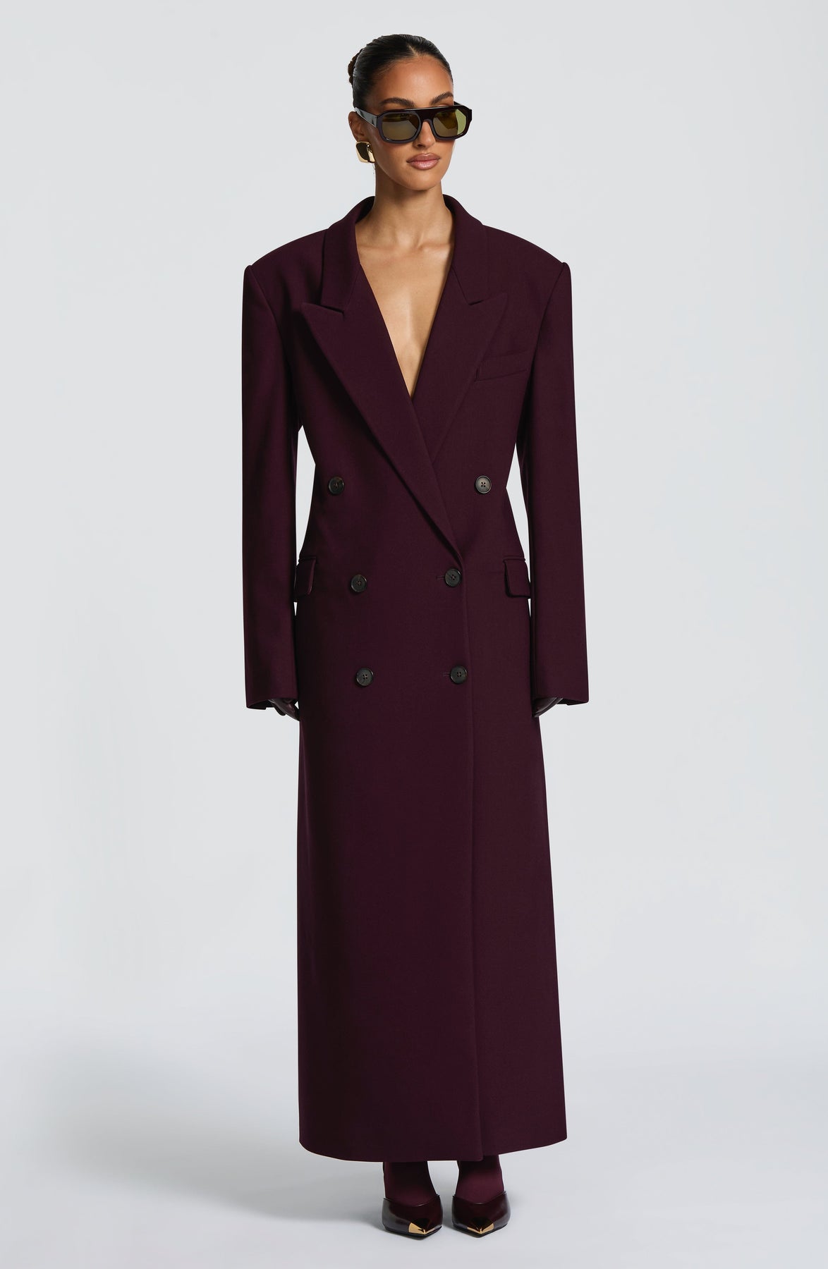 The Michelle Coat in rich plum features a structured boxy fit crafted from non-stretch woven suiting fabric. Its full length silhouette is refined with a double-breasted front, peaked lapel collar, and adjustable waist strap for tailored elegance. Practical details include double welt pockets with flaps and a centre back vent.