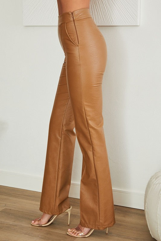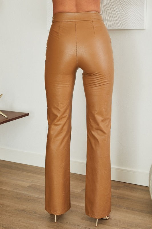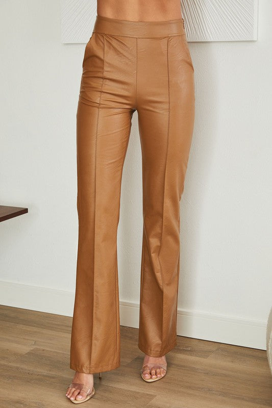 Pu leather front seam side invisible zipper flared dress pant front side pocket