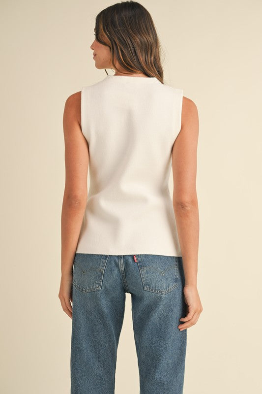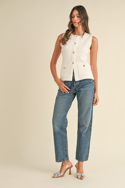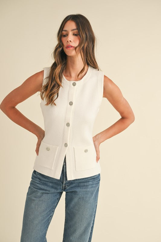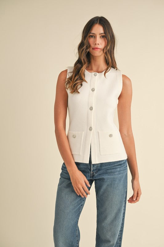 Indulge in luxury with The Mary top in beautiful cream. This stunning sleeveless sweater knit vest features delicate floral embellishments and rhinestone buttons, adding an exclusive touch to any outfit. Elevate your wardrobe with this elegant and versatile piece.