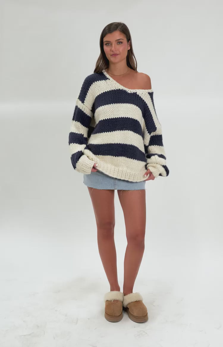 Our Delvey knit is the ultimate combo of cute and comfortable! Perfect for a coffee date on those colder days, this striped sweater will elevate any winter look. Pair with flared leggings and white sneakers for a comfortable outfit! Elevate the look with your fave jewellery.